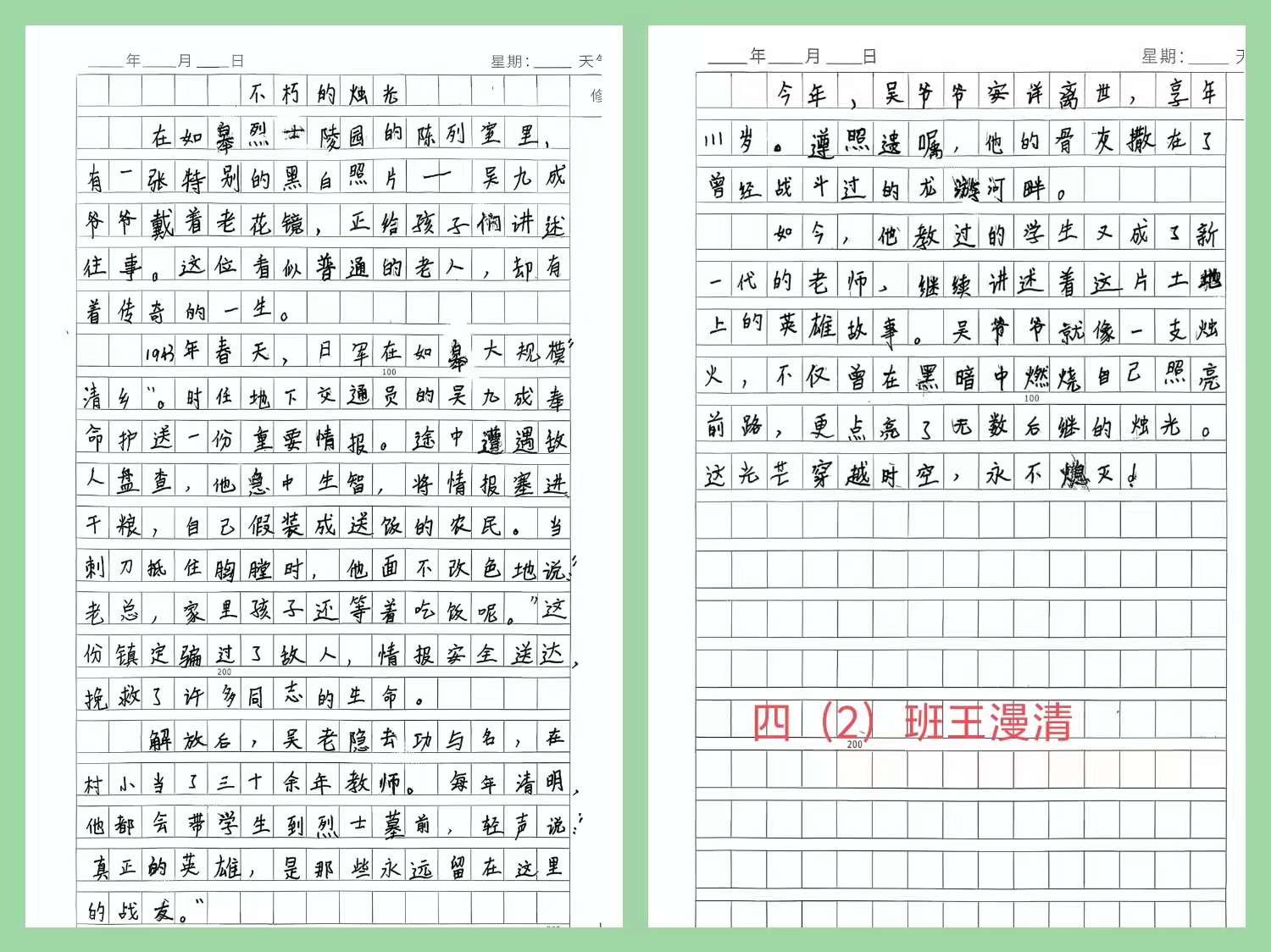 中年级学生开启“红色调研之旅”,翻阅史料、实地走访,聚焦一位位抗战英雄或革命先烈,撰写人物小传。一篇篇饱含真情的文稿,成为最生动的爱国主义教材。孩子们还化身“双节小主播”录制祝福视频:有的展示手作的国旗与玉兔摆件,有的朗诵“但愿人长久,我爱你中国”的创新诗句,稚嫩话语里满是对家国的赤诚。