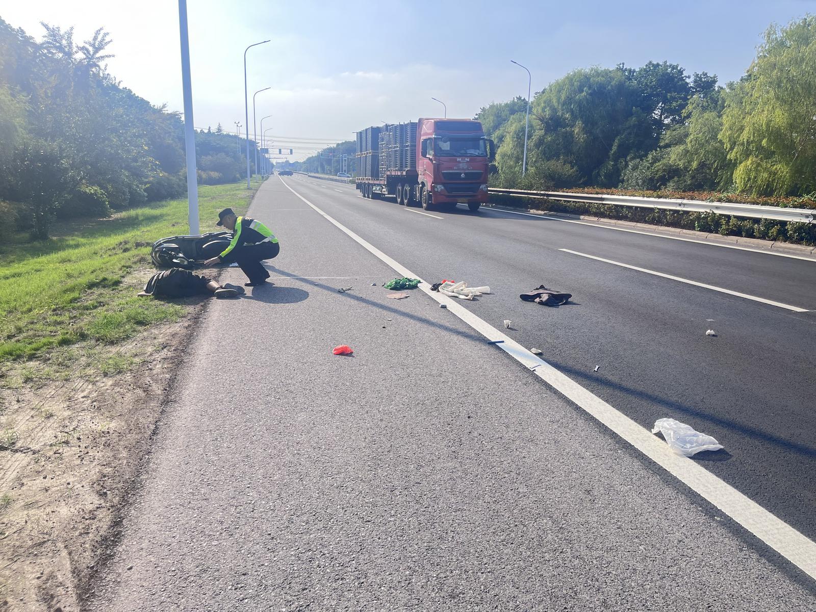 10日下午,南通市交通运输综合行政执法支队海安大队流动治超中队队长孙海晋带领队员,按照既定执法计划执行日常巡逻任务。行至328国道某车流密集路段时,他突然发现前方路边有异常——一名男子身体扭曲俯卧在路边,骑行的电动车和随身的背包、水杯等物品散落车道。