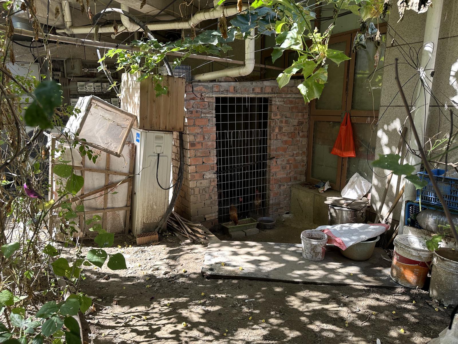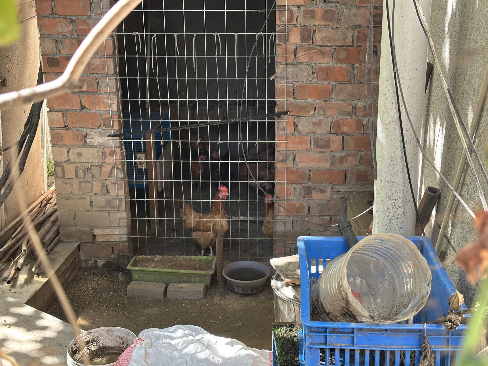 除了“菜园”和“果园”,记者潜行而入后,发现其间还深藏着三处规模各异的“私人养殖场”。其中一处笼舍由红砖垒砌而成,饲养着七八只鸡;另一处则用铁丝网、防水布搭建而成,里面饲养了一些鸭子;还有一处笼子旁露天放置着一大桶泔水,阵阵臭味随风飘散令人难以忍受。