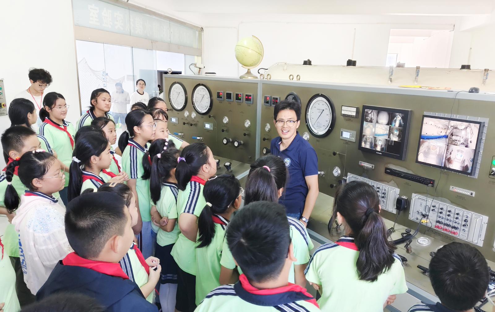 最让孩子们兴奋的环节,莫过于进入该校的200米饱和潜水模拟实验室。当巨大的潜水模拟舱出现在眼前时,孩子们忍不住发出“哇”的惊叹声。在南通大学特种医学研究院专业教师和学生志愿者的指导下,大家有序走进潜水模拟舱,近距离观察内部的设备、仪器,了解潜水舱的工作原理、航海医学的应用场景,以及我国在航海科技领域的发展成就。“原来这就是‘国之重器’!”“我们国家的科技好厉害!”孩子们的赞叹声此起彼伏。触摸着冰冷的钢铁外壳,听着工作人员讲述我国科技工作者攻坚克难、自主研发的故事,孩子们直观感受到了国家科技发展的硬核实力,也深刻明白“科技自立自强”不是一句口号,而是无数人努力奋斗的成果。这一刻,“长大要当科学家”“要为国家搞发明”的梦想,也在不少孩子心中悄悄萌芽。