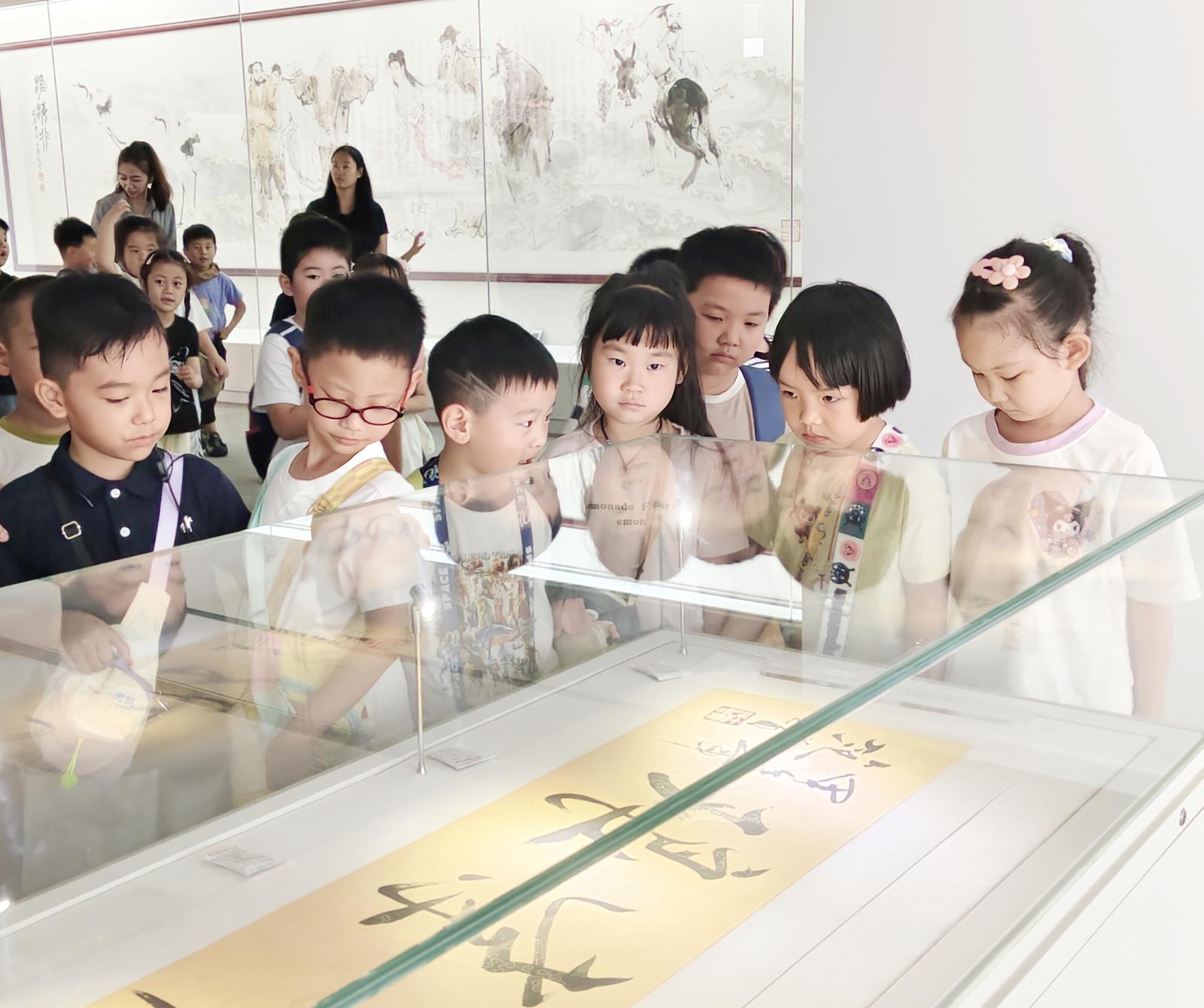 离开校史馆,孩子们又来到通大校园内的范曾艺术馆。推开大门,浓郁的艺术气息扑面而来。一幅幅精美的书画作品悬挂在墙上,或描绘山河壮丽,或展现人文情怀,笔墨间尽显中华传统文化的魅力。在南通大学老师的带领下,孩子们仔细观察画作的线条、色彩,聆听作品背后的文化故事。“老师,这幅画为什么要画这些山水呀?”“这些书法文字有什么特别的意义吗?”从传统水墨画的技法传承,到作品中蕴含的家国情感,孩子们时不时举手提问,在与南通大学艺术专业教师的互动交流中,不仅感受到书画艺术的美感,更在潜移默化中体会到中华优秀传统文化的博大精深。