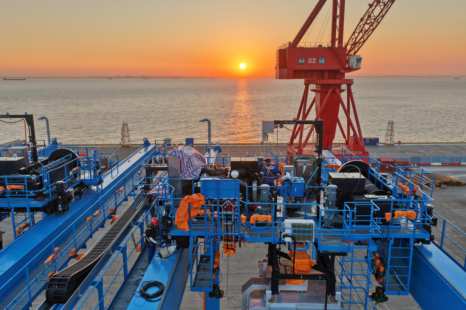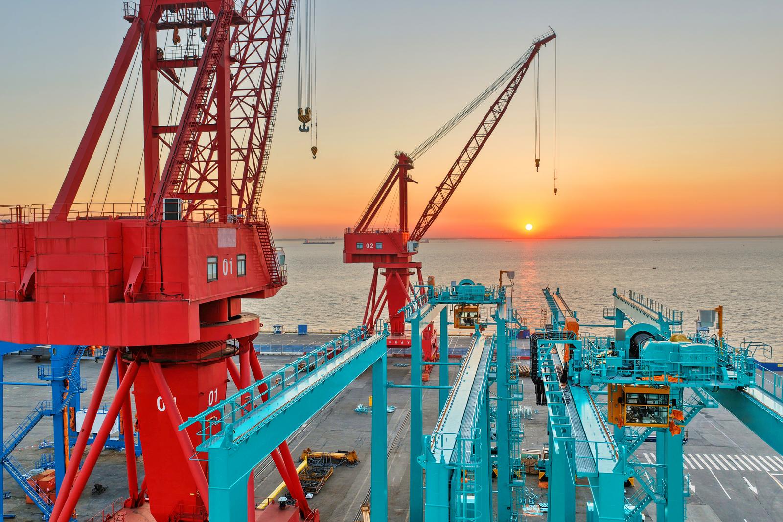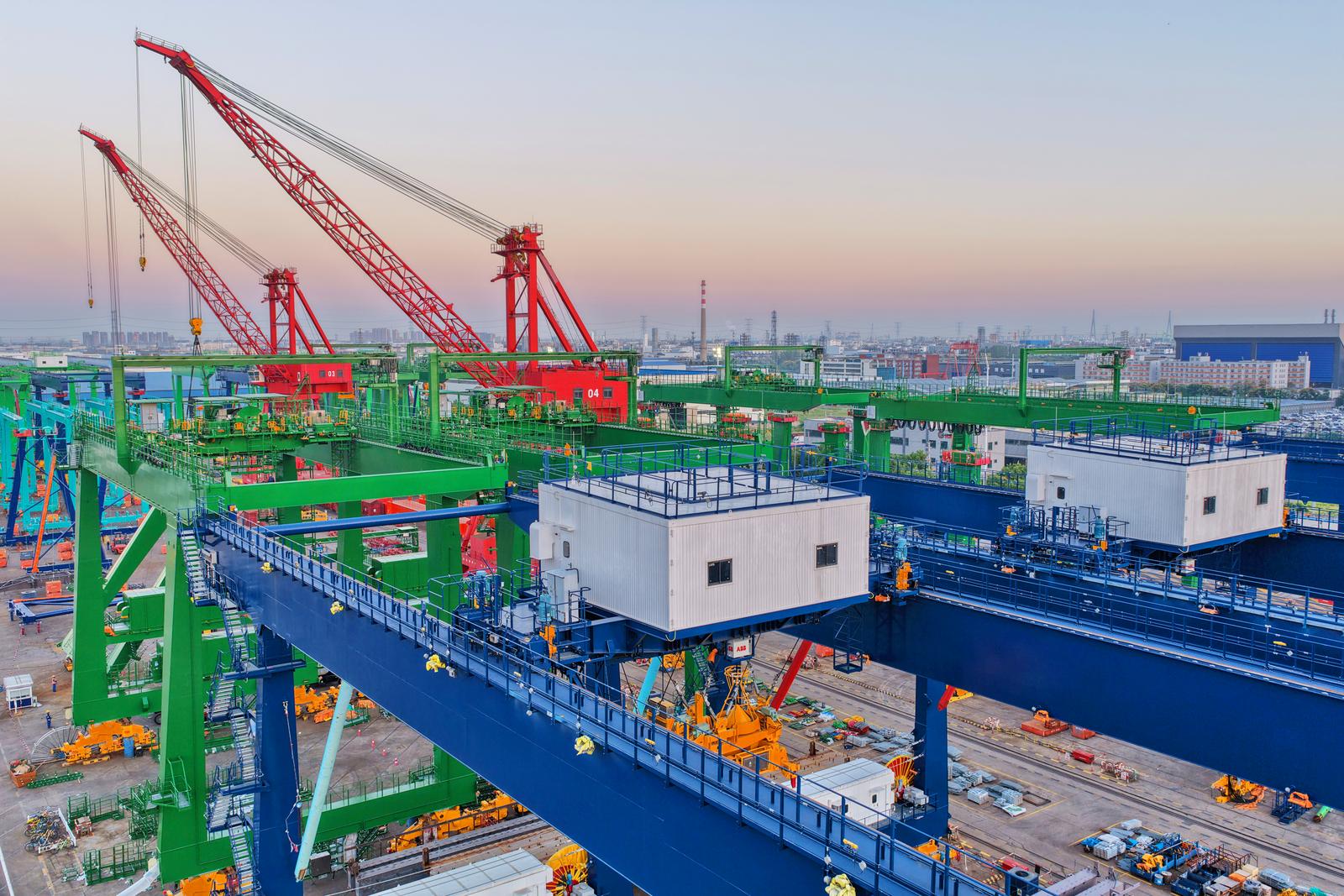 2025年10月9日在振华南通分公司拍摄的正在进行总装调试的港机产品。今年前9个月,振华南通分公司共向国内外发运港机设备230多台,助力斯里兰卡、沙特、墨西哥等国家,以及广州、上海、深圳等地区自动化港口建设。