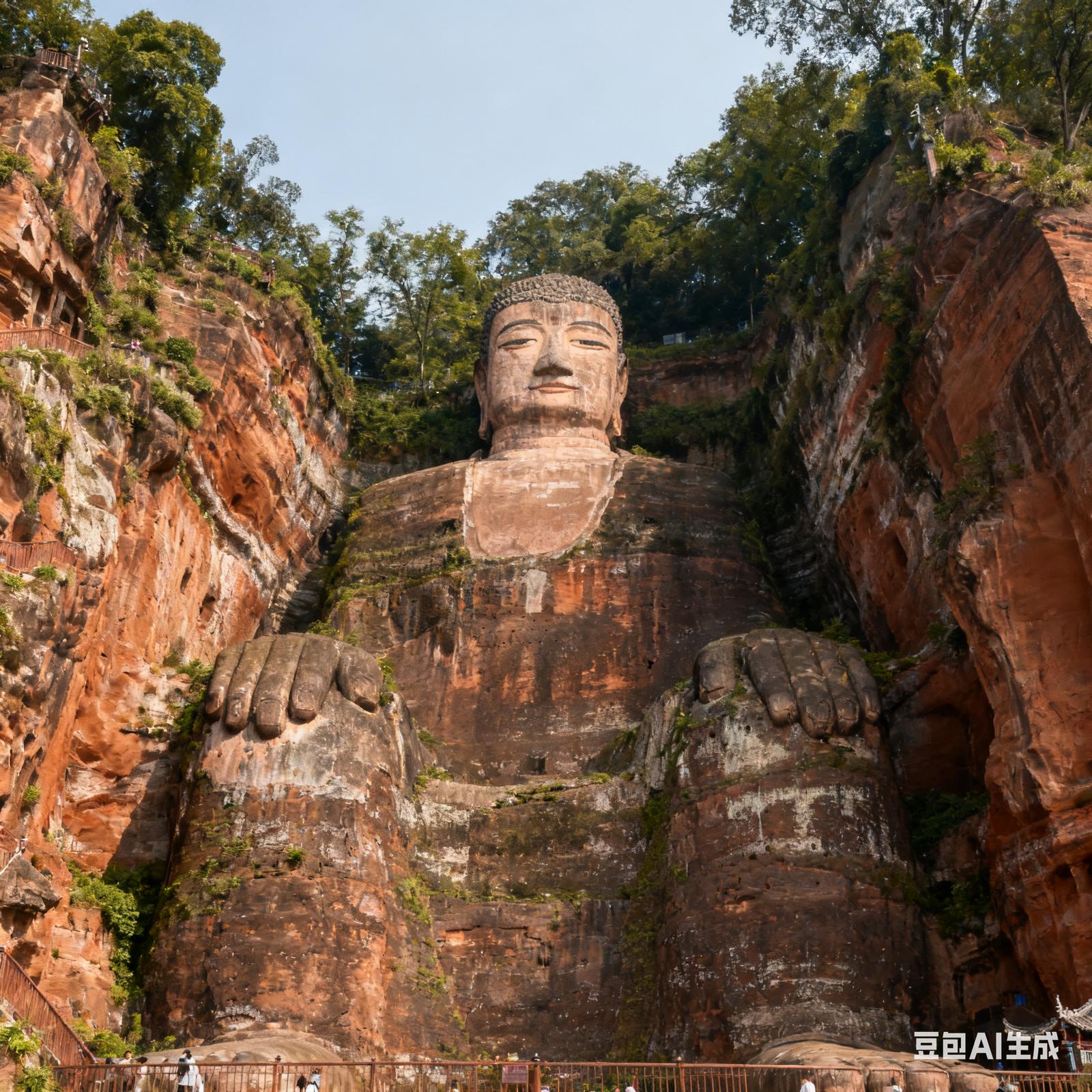嘉州凌云山的崖壁,似被时光凿开一道慈悲的褶皱——乐山大佛端坐其中,背倚丹霞赤壁,面朝岷江、青衣江、大渡河三江汇流。千年风雨在佛身刻下斑驳,却未减半分垂眸的温润。