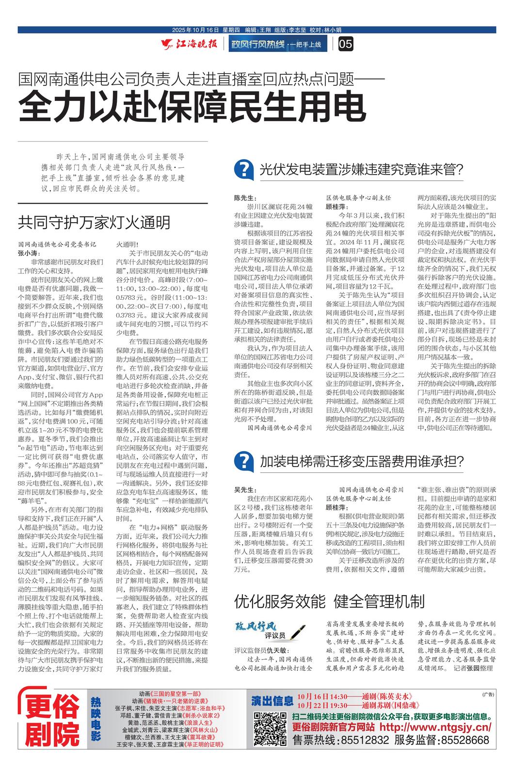昨天上午,国网南通供电公司主要领导携相关部门负责人走进“政风行风热线·一把手上线”直播室,倾听社会各界的意见建议,回应市民群众的关注关切。