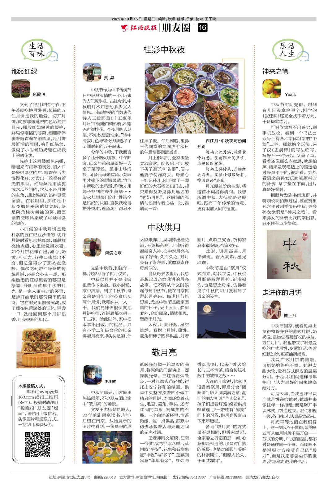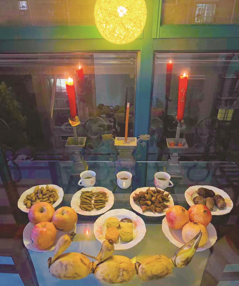 文友王老师是盐城人,30年前到南京读书,毕业后留在南京。从她展示的图片中看到,一盏悬垂的球形暖光灯像一轮温柔的满月,将深色的门窗映出一圈朦胧光晕。三炷香青烟袅袅,一对红烛火苗轻摇,衬托出安宁祥和的氛围。供桌中央整齐摆着四个做工精致的月饼,周围环绕着花生、毛豆、菱角、芋头,还有红润的苹果、咧嘴笑的石榴。三个白瓷茶杯里,清茶微漾。这一桌供品,静默中仿佛承载着人与天地之间的无声对话。