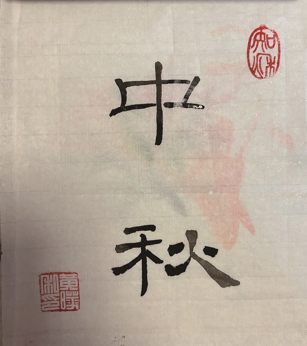 可惜依然写不出感觉,刷手机放松。看到一个书法公众号上有各种字体组字的“中秋”二字。那就换个玩法,选了汉《史晨碑》的写法临写。写好后一时兴起,又盖了章。看着还像那么点意思,就想拍照,结果发现毛毡上的墨迹透过来黑乎乎的,很难看。突然看到之前孙女玩画笔颜料时的涂鸦,拿了垫在下面,出片真是好看啊。