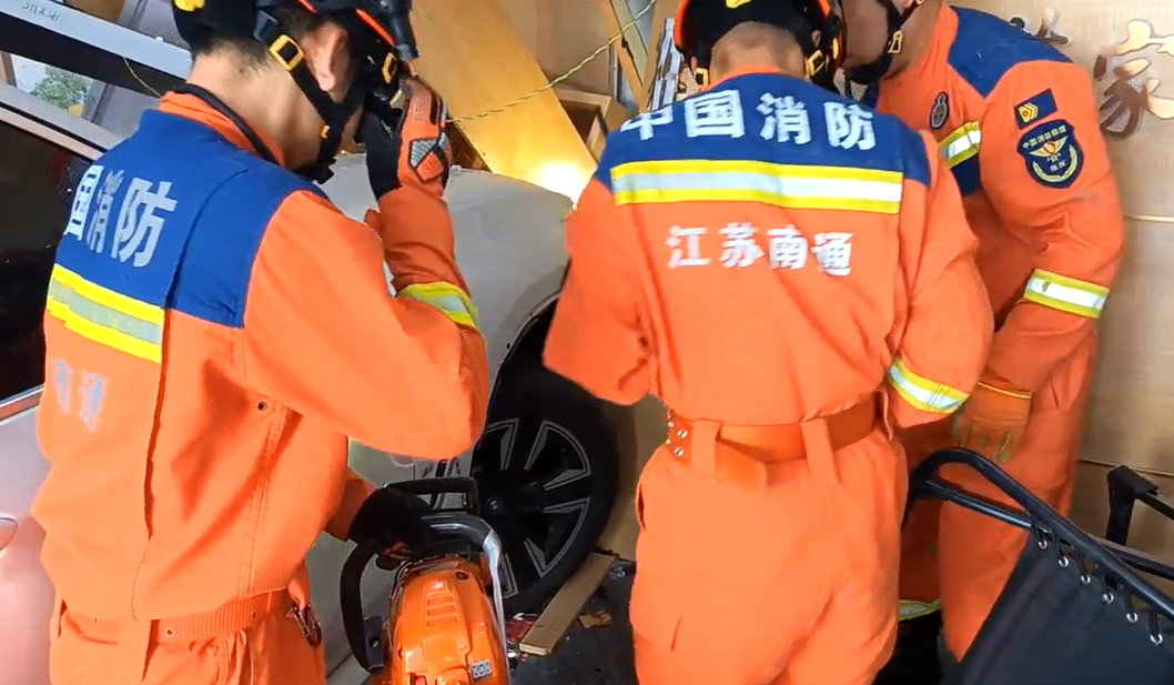 一辆SUV不慎冲进店铺 消防用绳拉车救出被困女子