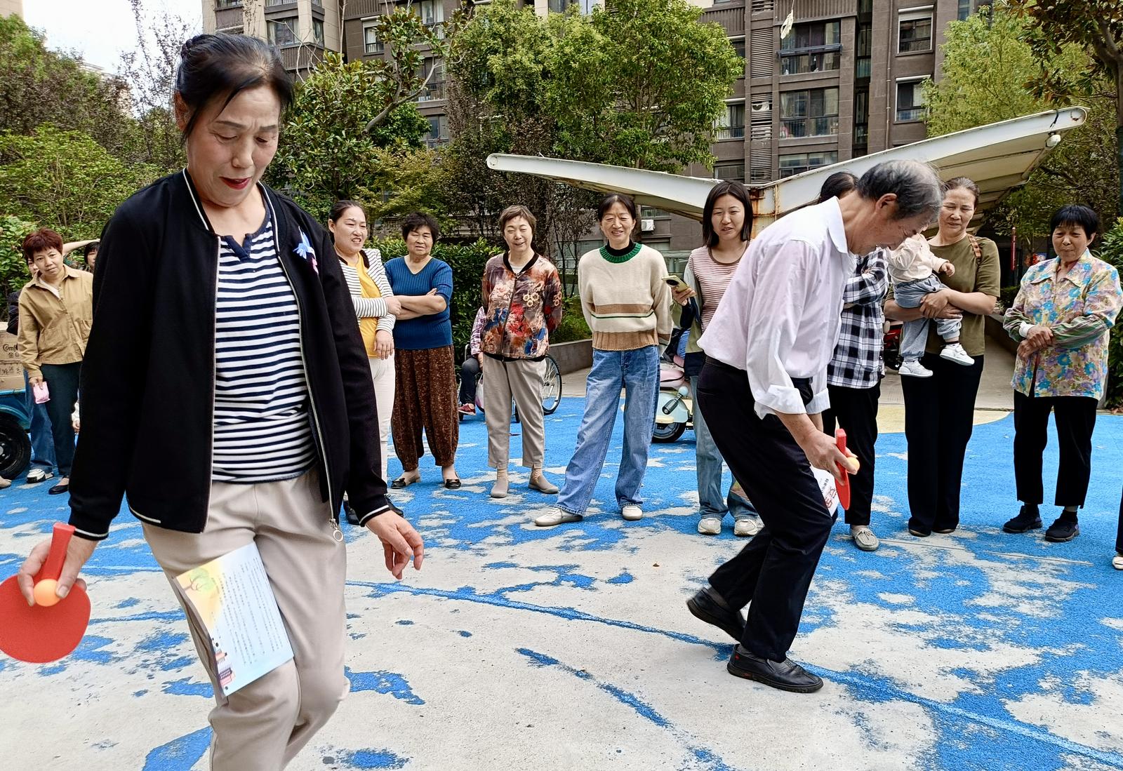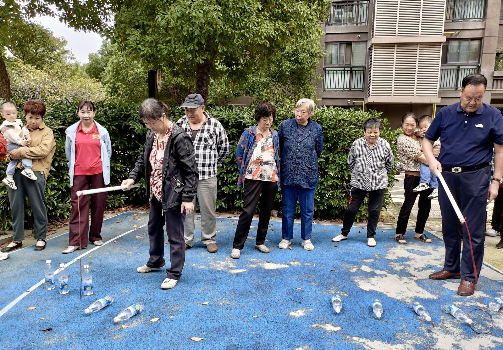 文艺演出过后,趣味游戏环节紧接着登场,四个精心设计的小游戏让现场氛围瞬间沸腾。在“水瓶回正”游戏中,老人们屏住呼吸,小心翼翼地将倒放的塑料瓶扶稳摆正,成功时的欢呼声此起彼伏;“夹纸运书”游戏考验默契,两人一组用膝盖夹着纸片运送书本,有的动作娴熟快速通关,有的偶尔掉落书本重新返回起点,引得全场笑声不断;“传球蹲游戏”最是热闹,老人们围圈而站,传着皮球,有人反应快,蹲得又稳又及时,有人稍慢半拍,惹得观看者哈哈大笑;“顶球叠杯”游戏,老人们一手推球防落地,一手按规摆杯子,手眼脑需同步,稍有分心便会出错,老人们专注的神情格外可爱。夕阳西下,活动接近尾声,老人们脸上仍带着未散的笑意,纷纷说:“这样的活动真好,又看节目又玩游戏,比在家热闹多了!”