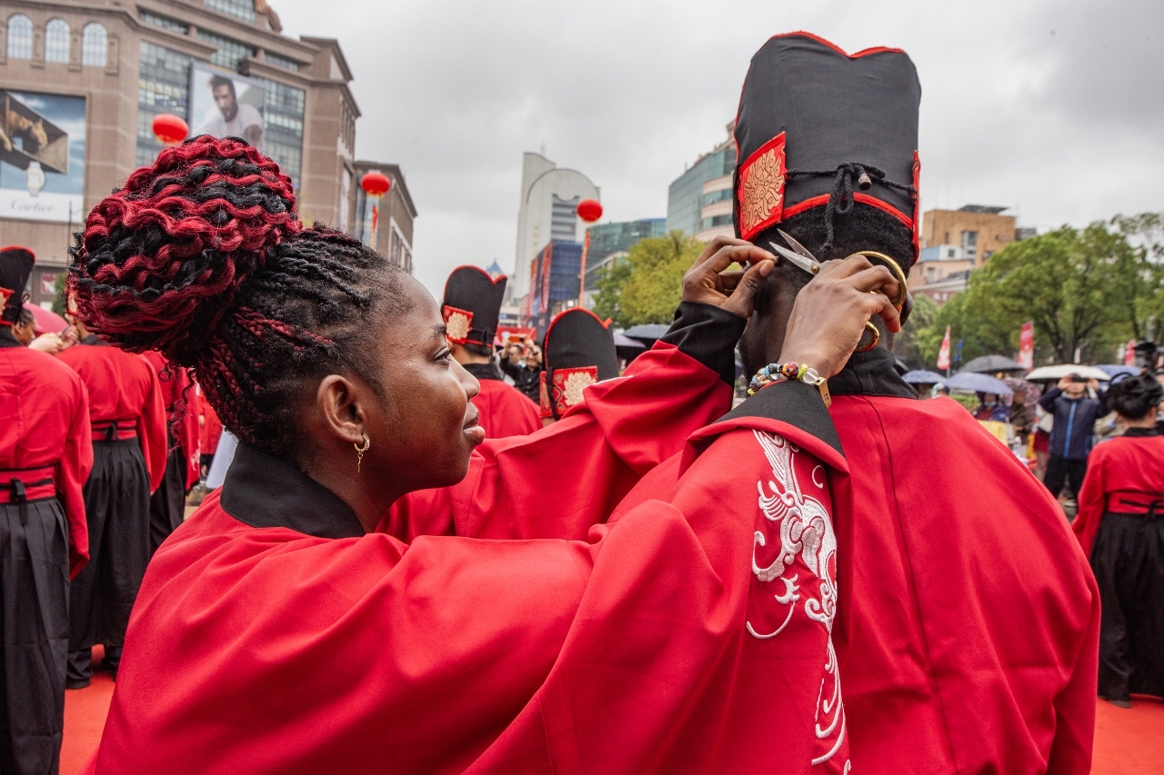活动当天,南通钟楼广场装扮一新,新人伴着古典民乐依次入场。现场不仅有“汉舞+民乐”表演,古筝独奏《高山流水》尽显东方韵味,更通过“服饰快闪”环节展示了“一带一路”共建国家丰富的婚俗文化。在仪式核心环节,新人遵循汉代传统,庄重完成“沃盥礼、合卺礼、结发礼”,并在钟楼与濠水的见证下集体宣誓,新人家长及亲友团现场送上祝福。