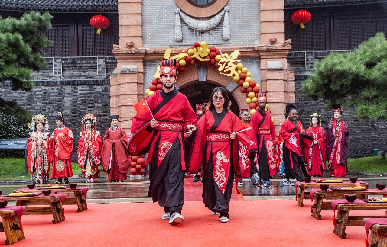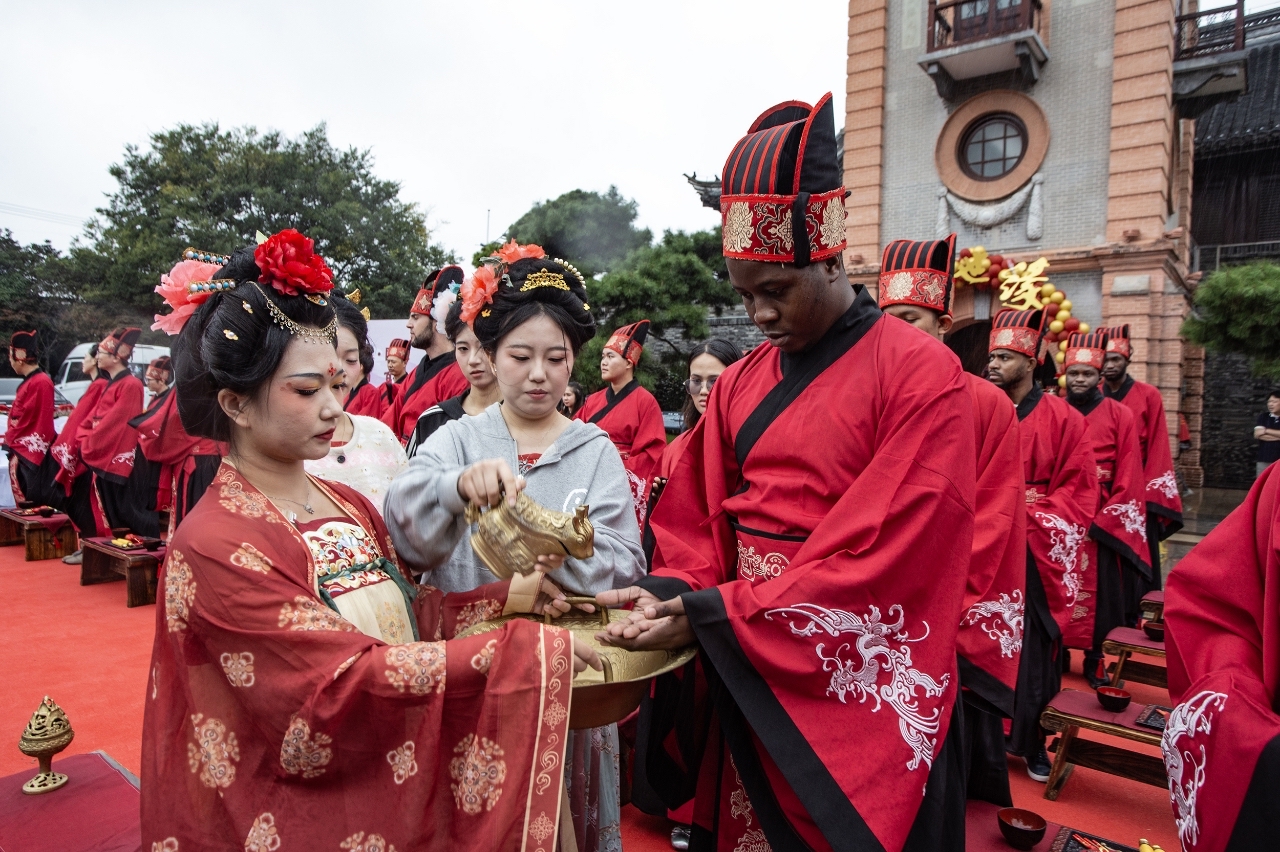 10月18日,一场融合汉文化特色与国际交流意义的集体婚礼在江苏南通濠河之畔举办,来自“一带一路”共建国家和地区的20对新人身着传统汉服,以汉式婚仪许下百年之约。