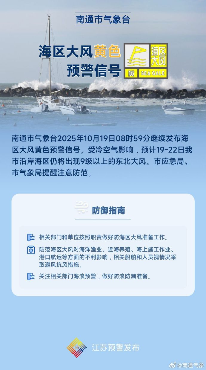 南通市气象台2025年10月19日08时59分继续发布海区大风黄色预警信号。受冷空气影响,预计19-22日我市沿岸海区仍将出现9级以上的东北大风。市应急局、市气象局提醒注意防范。