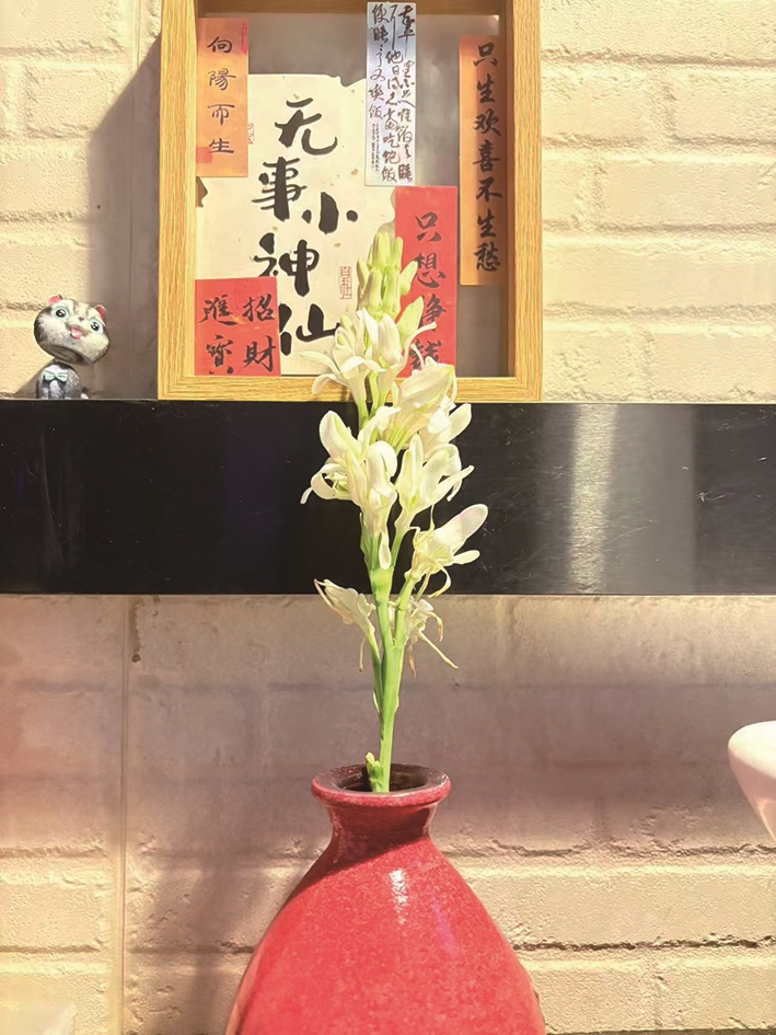昨晚回家,我把在车库门前采摘的一枝晚香玉插到花瓶里,满屋子顿时都是醉人的花香。