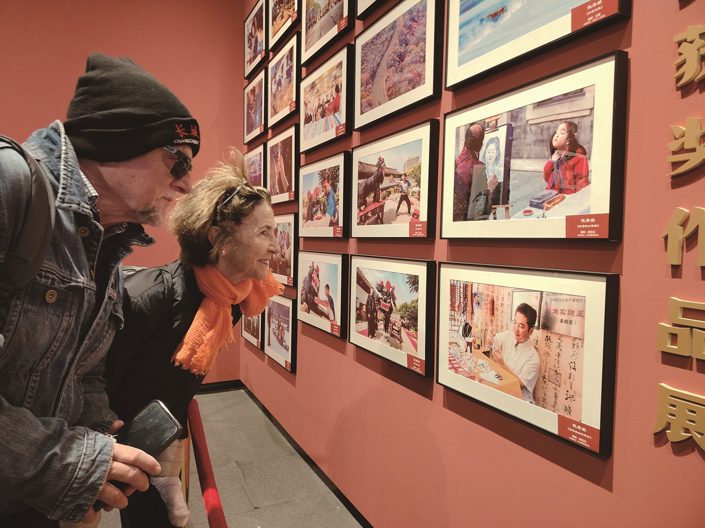 10月19日上午,北京市劳动人民文化宫的“祖国颂——京津冀职工书画作品展”现场,两位外国友人正专注地凝视着墙上的摄影作品,其中一位头戴印有“长城”字样的黑色帽子,身着牛仔外套的随性与对中国文化的认真探索形成有趣的反差;身旁的女士围着一抹亮眼的橙色围巾,在暖色调的展墙映衬下,满是对画面内容的好奇与欣赏。