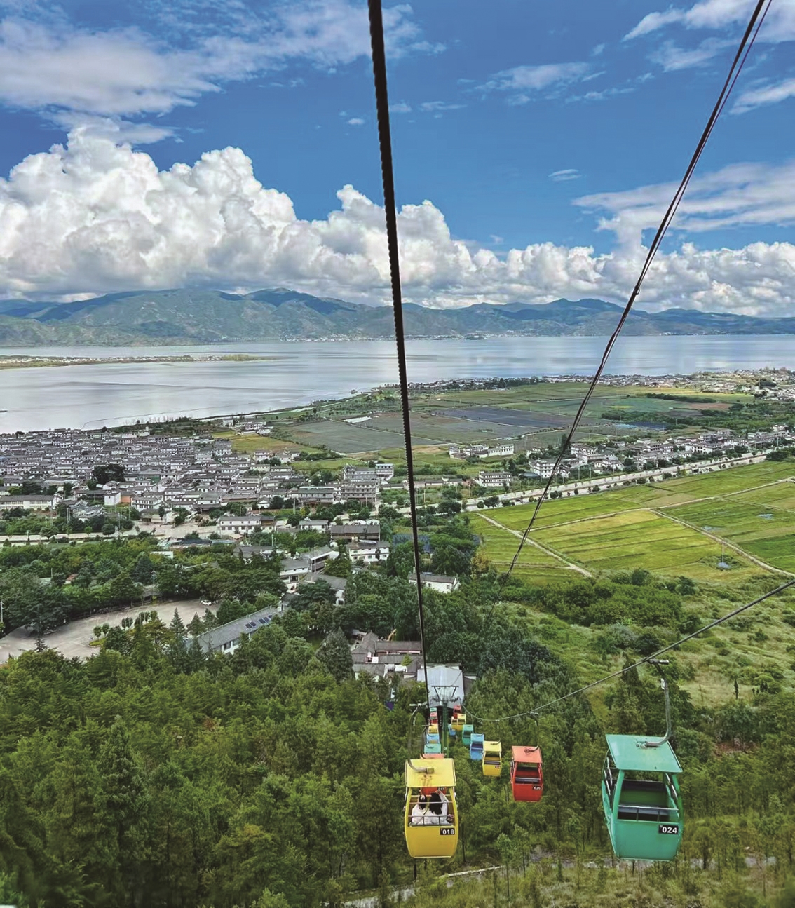 阿梅推荐得一点没错,当索道缓缓开动,奇景出现了:吊篮在秋日的和风丽日中缓缓移动,仿佛是一颗颗硕大的水果方糖,柠檬黄、橘红、蓝莓色……散发着甜美的气息。从吊篮上俯瞰,可见洱海宛如一轮新月,静静地依卧在苍山和大理坝子之间。而尽力眺望洱海对面的苍山山峰,就可看到大理特有的低云,像白茫茫的棉花糖一样堆叠在山峰上。白云的丰满与低回,令环绕洱海的山峰似乎萦绕着交响诗一般的回声——山与云、水与光,都在瞬间浮现灿烂的音韵。