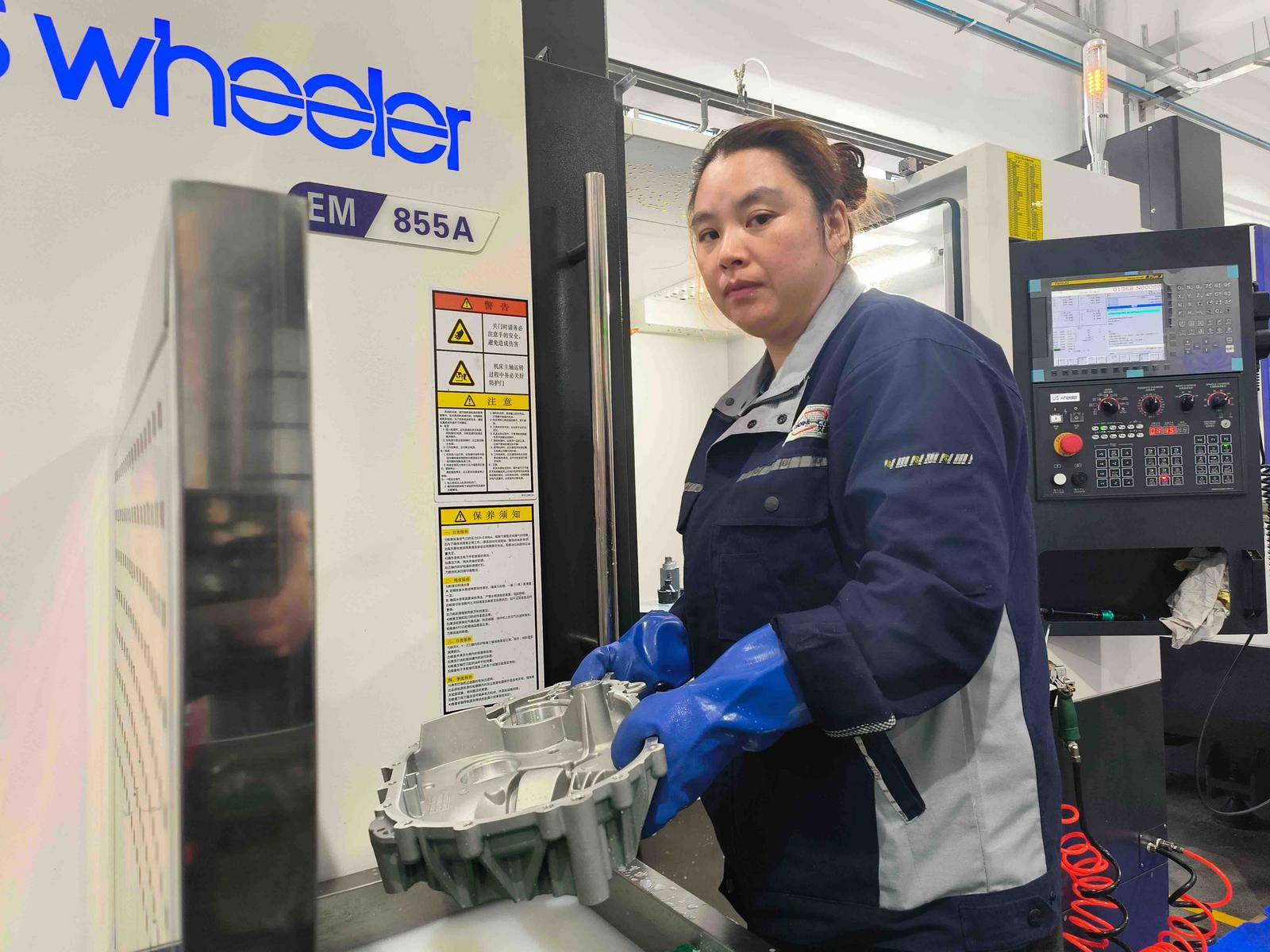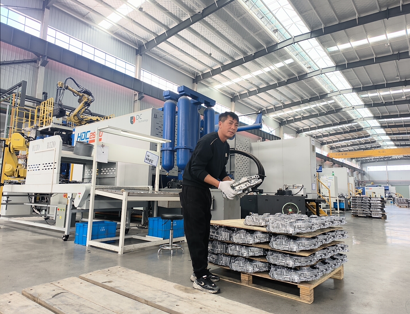 机械臂挥舞不停,将卧式冷室压铸机浇铸的新能源汽车电机端客体稳稳“接”下,转眼送进立式加工中心完成精密切削,一个个刚下线就成了市场抢手货……10月24日,江苏艾通华精密科技有限公司的车间里,试生产期的繁忙扑面而来——日产3000台套的产能持续运转,产品直供隔壁如东经开区的江苏御传新能源科技有限公司。这标志着总投资5.2亿元的艾通华5G通讯设备零部件项目,正式“加盟”园区汽车零部件产业链“合作圈”;待项目全面达产,每年将新增应税销售5.4亿元。