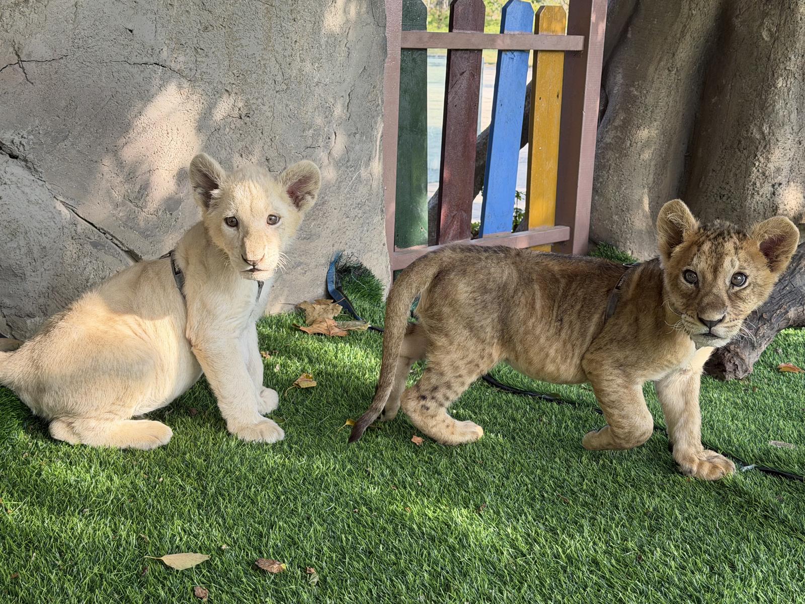 说话间,身后一黄一白、两只萌狮宝宝也亲昵地凑到饲养员脚边。牛勇亮告诉记者,这两只两个多月大的非洲狮幼崽的名字背后同样藏着一段故事。
