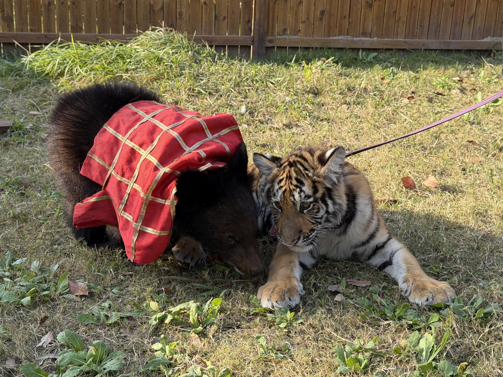 记者跟随景区工作人员搭乘观光车前往不同采访点,沿途不时可见小朋友与动物们开心地互动。不过,最受万众青睐的,要数园区的“顶流明星”——名叫“三万”的六个月大东北虎幼崽。