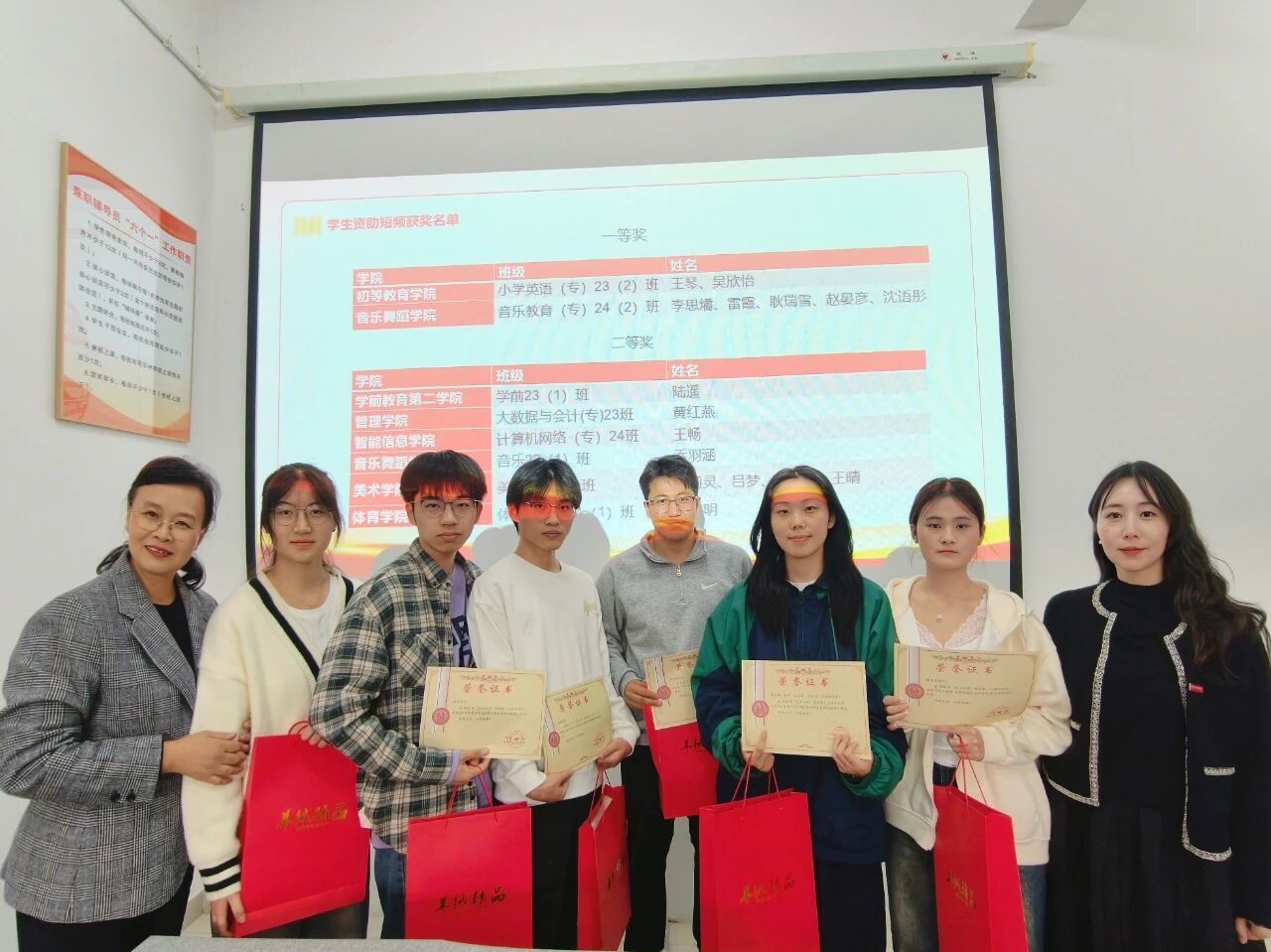 随后的“政策之声・创意表达”环节,6位同学通过个性化的自我介绍以及精心制作的视频作品,将资助政策以更直观、更鲜活、更易于接受的方式进行传播,充分展现了青年学子的创造力与对政策的深刻理解。在“荣耀时刻・匠心绽放”环节,学校为获“优秀资助育人工作案例”的老师、“2025年度资助宣传大使”以及“学生资助短视频”一、二、三等奖的学生代表颁发荣誉证书及奖品。