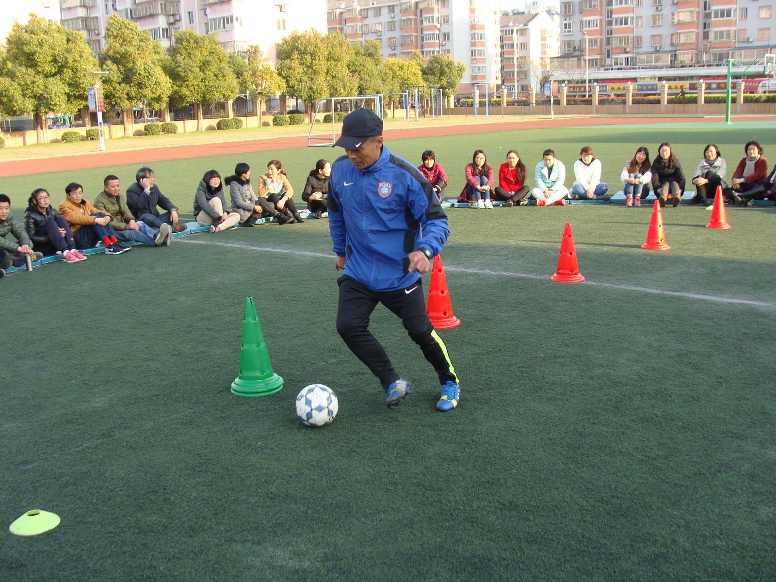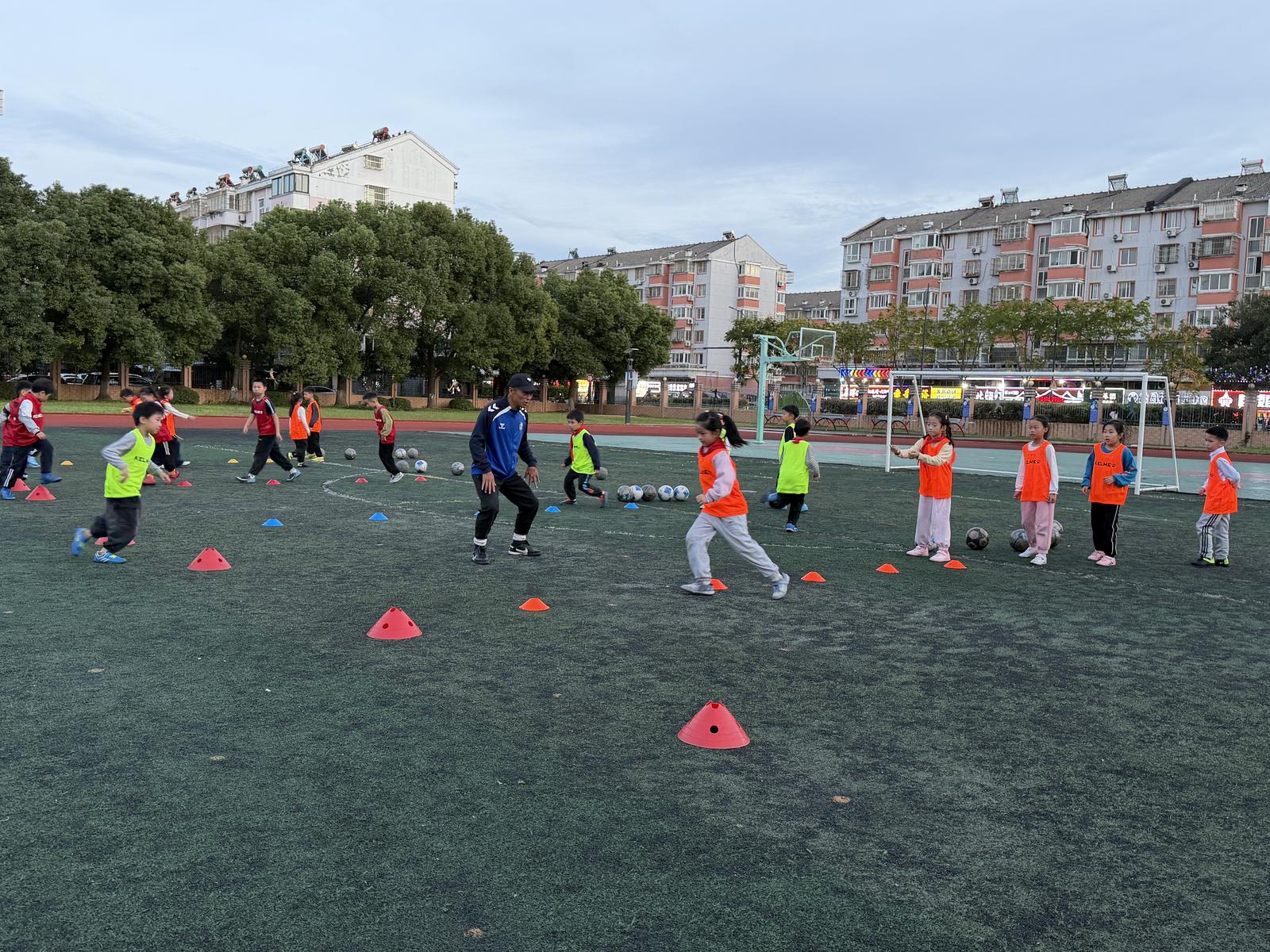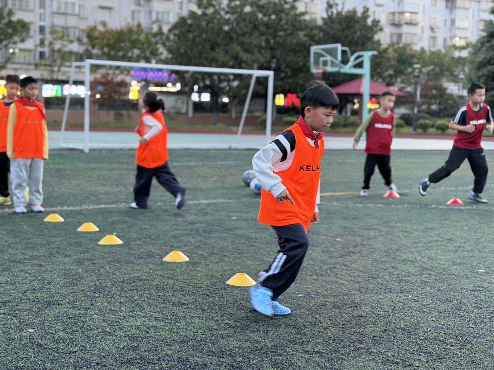 “脚尖轻轻点,带着球绕过去……”10月29日下午4点半,夕阳的余晖给十里坊小学的操场镀上一层温暖的金色。一群身着球衣的孩子跟在体育老师身后,展开运球绕桩的日常训练,个个精神抖擞。“我觉得带着球绕桩就像在跳格子,特别好玩!”一年级学生陆思媛额前的头发被汗水濡湿,眼睛却亮闪闪的。她这学期刚刚加入足球社团,已经“喜欢上了踢球”。