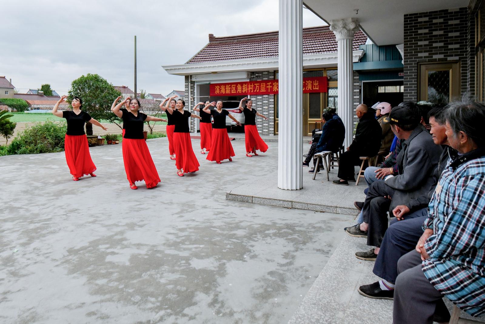 夜幕降临,社区王奶奶家门前乐曲欢快。一支由退休阿姨自发组建的“红旗情舞蹈队”正在翩翩起舞。她们身着统一服装,步伐轻盈,动作整齐,定期到乡亲们门前进行义演,成为角斜一道流动的风景线。