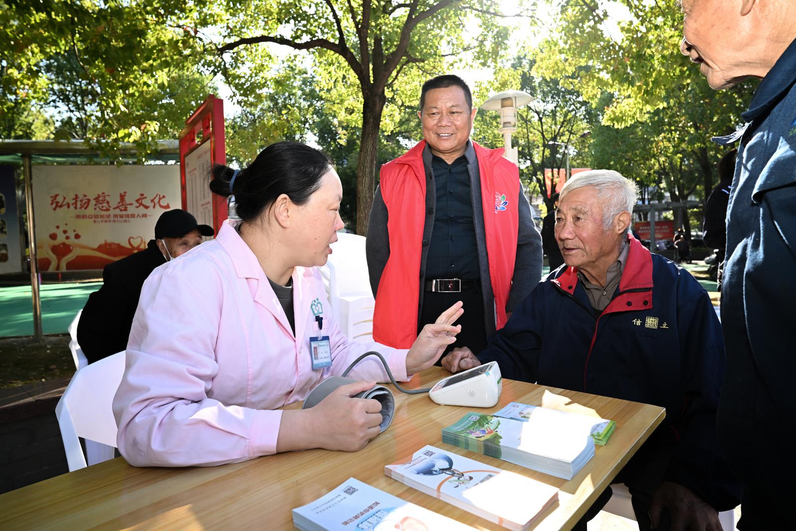 广场一侧的暖心服务与后续的佳宴活动紧密衔接,共同构筑了敬老爱老的温馨场景。爱心义诊、防诈骗宣传、企业招聘等摊位前围满了村民;江苏台钢智能科技发展有限公司为90岁以上高龄老人赠送拐杖;幕布摄影点则为老人们定格幸福瞬间。