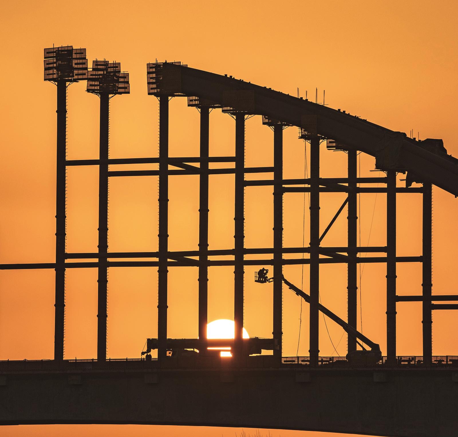 上月31日傍晚,沪渝蓉高铁启东市三和港特大桥施工现场,升降平台上作业的工人形象在夕阳映衬下格外醒目,与高大钢架构成一幅美丽的画面。季青春