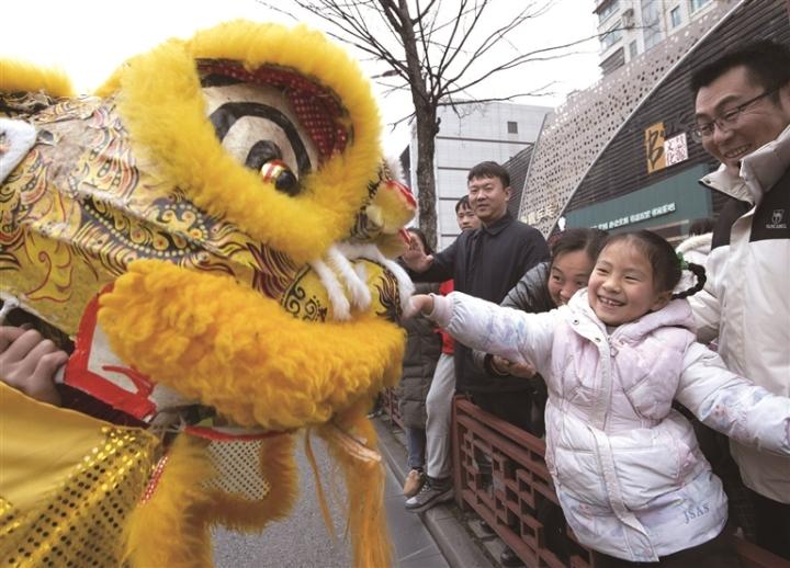 2月2日,正月初五,海安市“龙腾狮跃贺新春”龙狮巡游展演活动上,一名小观众与舞狮人快乐互动。 徐劲柏