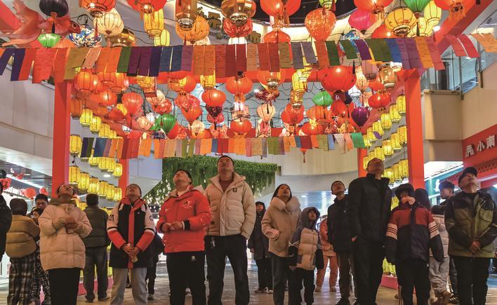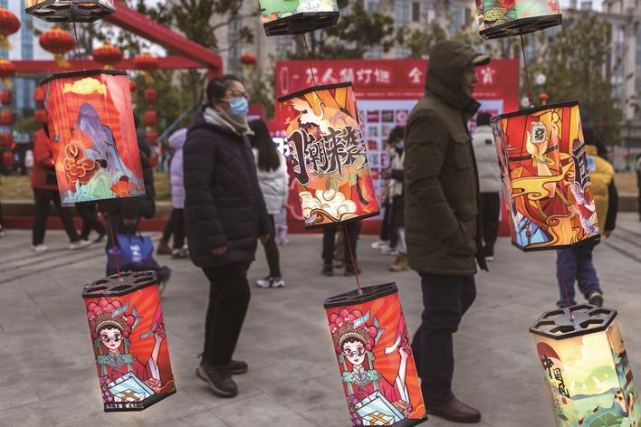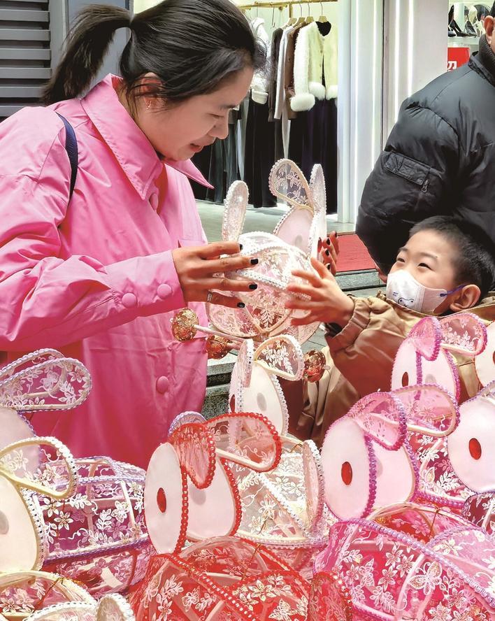 2月12日,市民带着小朋友挑选兔儿灯,欢度佳节。 瞿德均