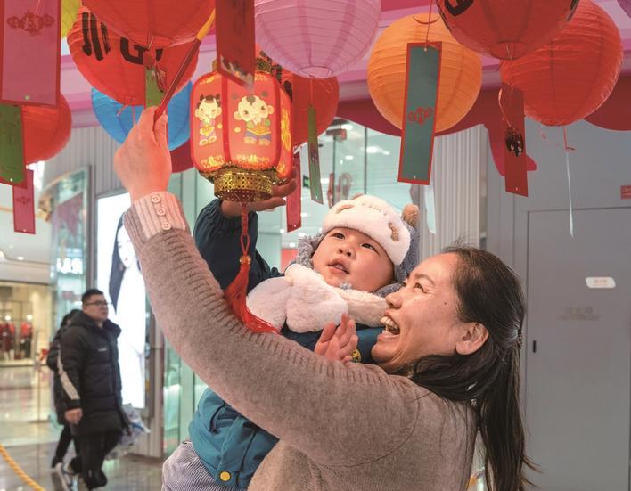 2月12日,启东市吾悦广场,家长怀抱萌童喜猜灯谜。黄是春