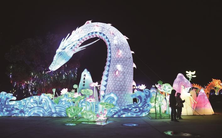 2月12日,元宵节,两名游客在海门花漾谷游园会上观赏灯光落花秀。施敏