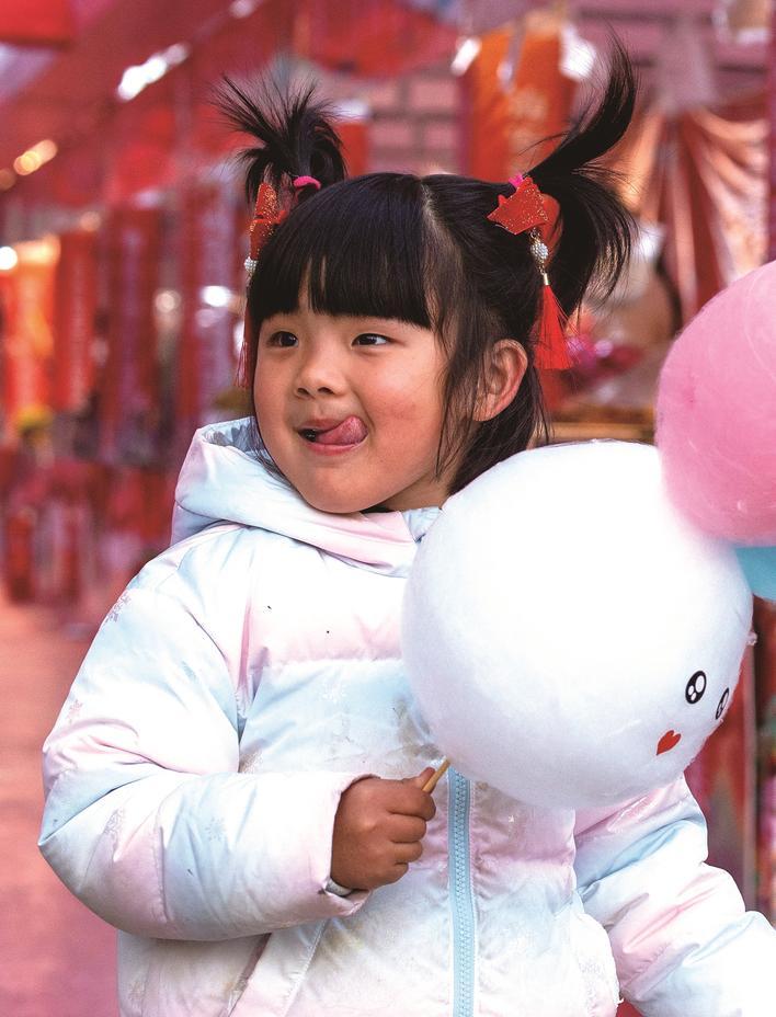 2月2日,海安喜润城人头攒动,一名小朋友在品尝棉花糖。商场内各种各样的风味小吃让市民和游客品尝到浓浓年味。徐劲柏