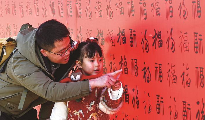 1月29日,海门区花漾谷景区,一名年轻的家长教孩子辨认各种字体的“福”字。 王培中