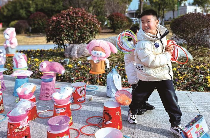 2月2日,海门府南绿廊,一个孩子套圈赢得了奖品。陈志发