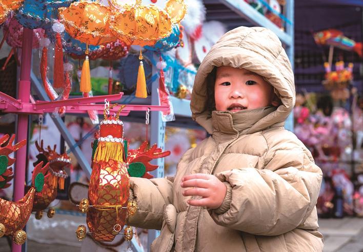 2月12日,如皋古城东大街各式花灯琳琅满目,小朋友看中了一款大嘴巴龙灯。蒋红霞