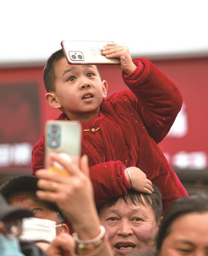 2月2日,市区南大街热闹非凡,人们纷纷涌上街头观看新春民俗巡游。人群中,一名小男孩坐在家长肩头,拿着手机,满眼新奇地拍摄巡游盛况。袁建