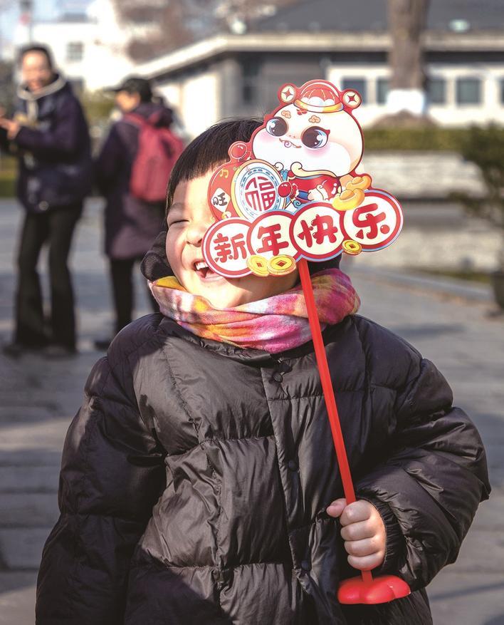 1月19日,南通博物苑,孩子拿着祝福新年的装饰物开心大笑。陈鲁明