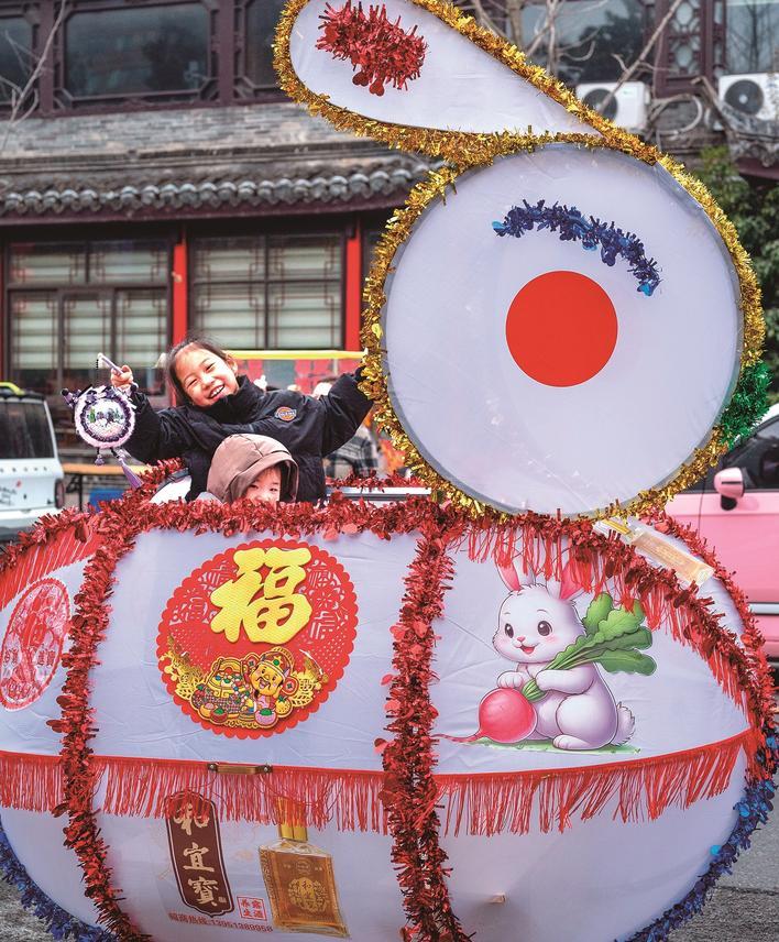 2月12日,如皋市东大街,两个孩子坐在一只巨型兔儿灯内,快乐庆元宵。蒋红霞