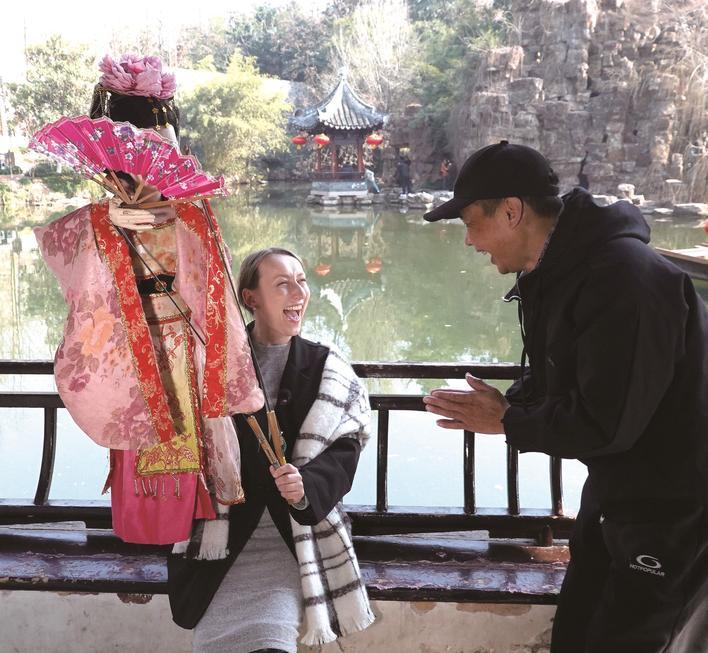 1月20日,如皋市水绘园,意大利籍游客快乐学习木偶戏,感受中国文化。王晓峰