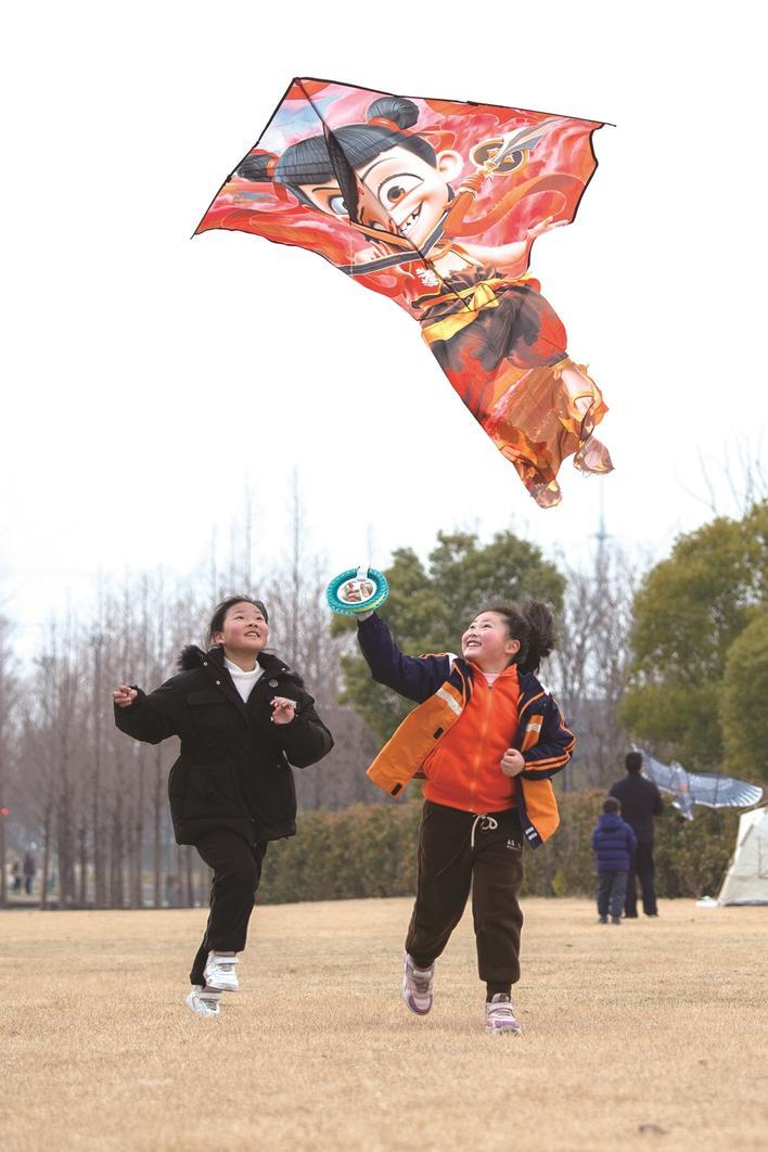 3月9日,海安市通扬河生态区,春风和煦,孩子们放飞风筝,快乐奔跑,享受美好春光。静心