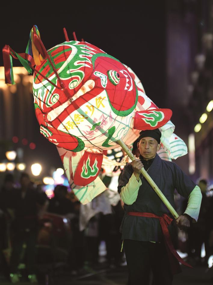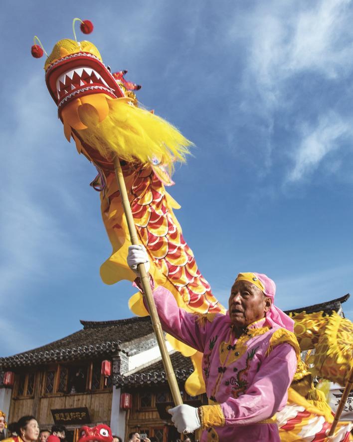 1月30日,唐闸北市街,舞龙表演中,一名“老龙头”擎起高昂的龙头。 陈鲁明