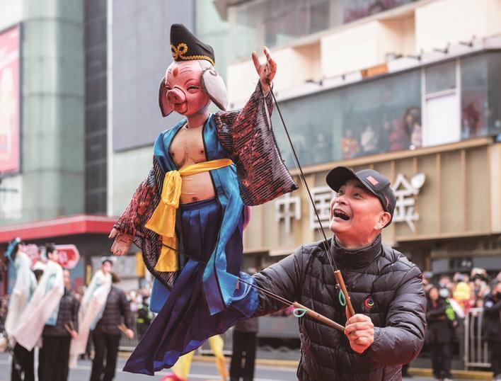 2月2日,南通新春民俗巡游活动,如皋方阵表演的“如皋杖头木偶”,给市民带来节日快乐。 袁德君