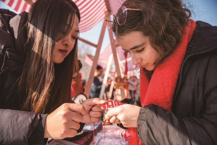 1月19日,在“非遗走进博物苑”活动中,一名外国留学生学习中国刺绣。 田园