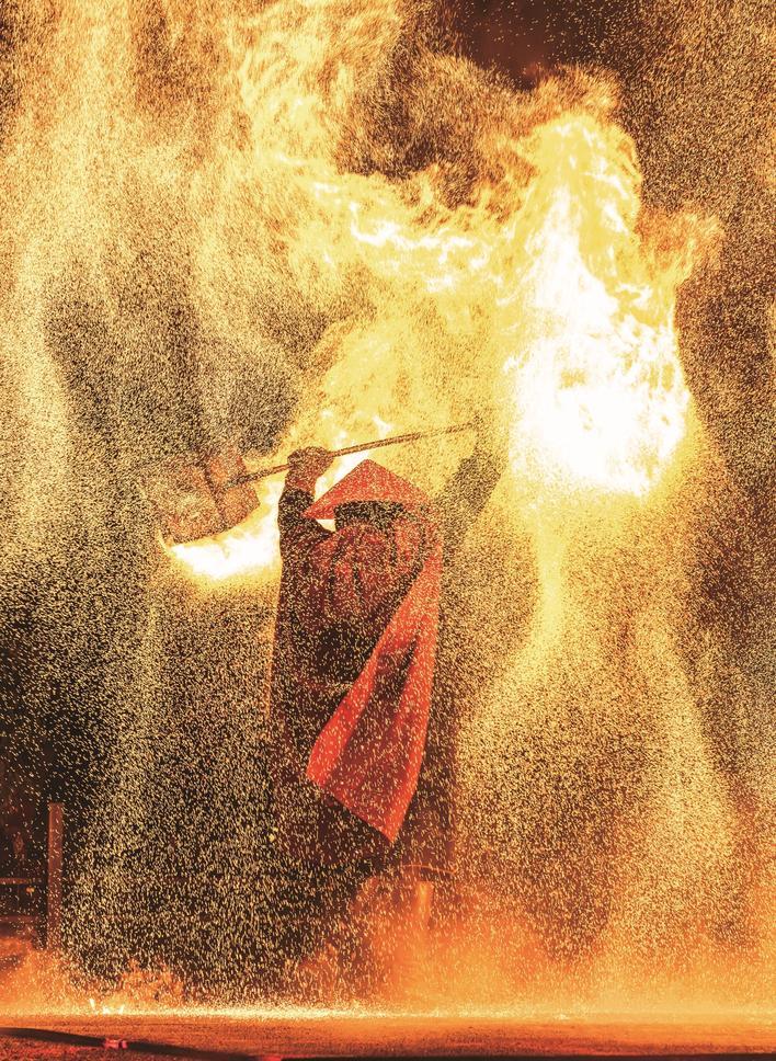 1月25日,狼山首届新春灯会非遗火秀表演现场,来自河南洛阳的非遗传承者团队进行火壶表演。范鎧毓