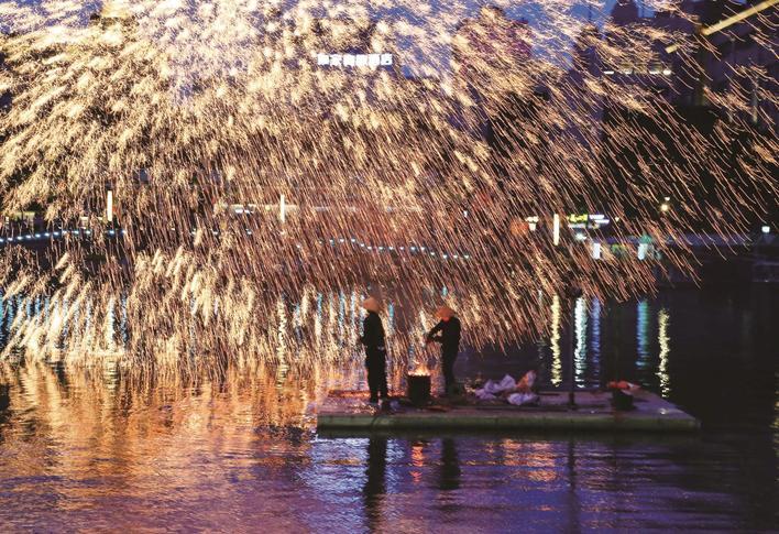 2月1日,市区濠河景区举行传统民俗表演“打铁花”。 李斌