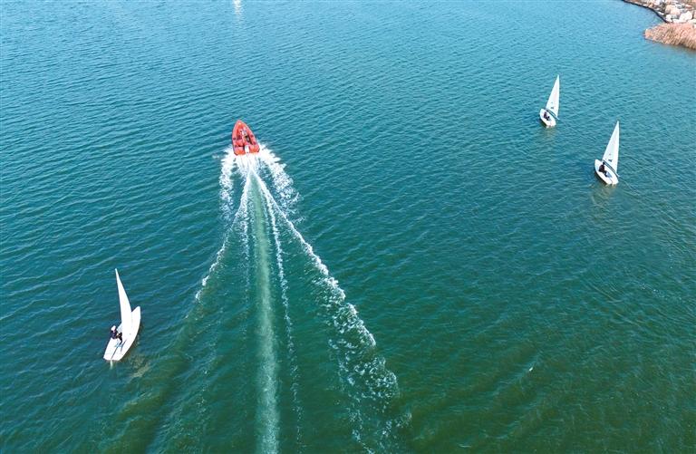 3月8日,海门謇公湖帆船集训基地,碧色湖面上白帆点点,一艘红色摩托艇划破水面。宋武斌