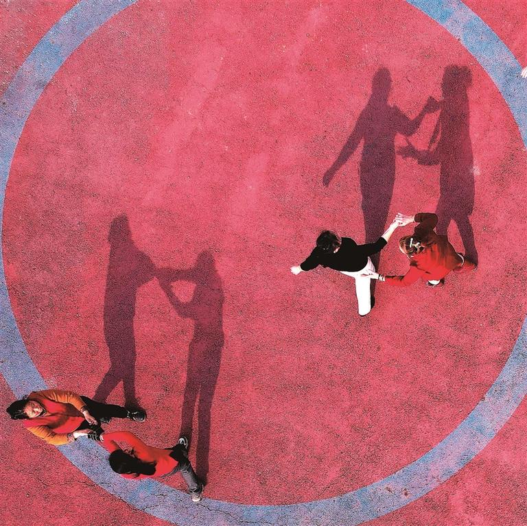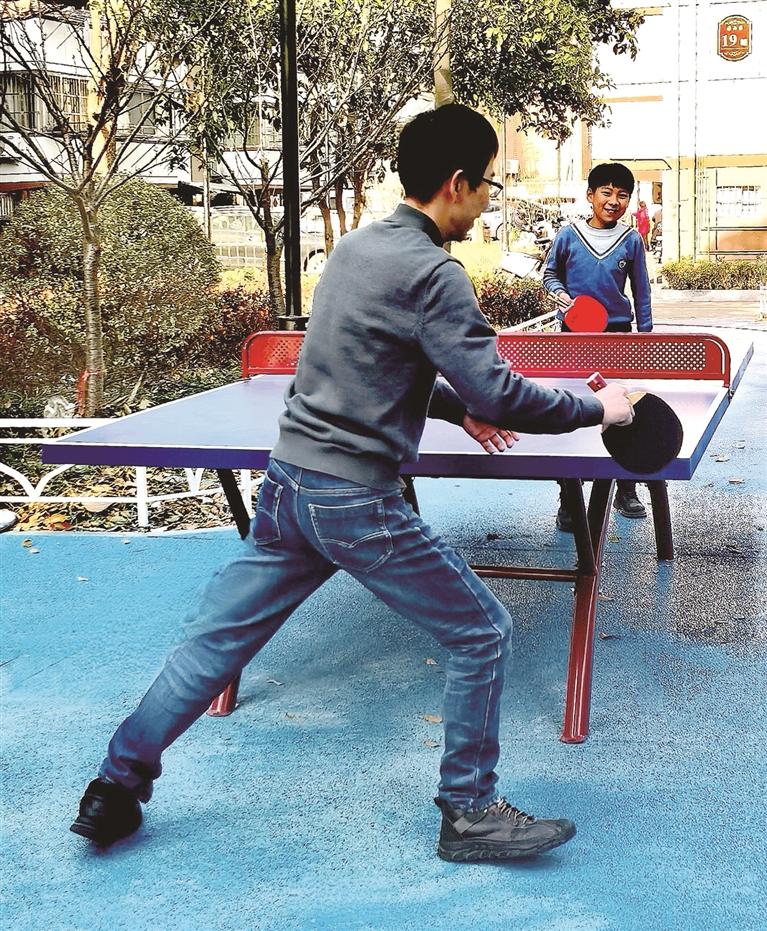 3月21日,市区一个改造后的小区里添置了体育器械。父亲拉着儿子下楼打乒乓球。佚名