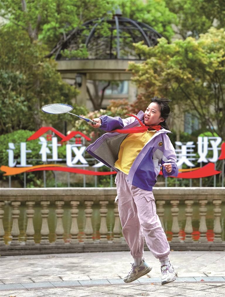 4月12日清晨,市区绿地新都会羽毛球场。一名小女孩身着轻盈运动装,全神贯注练习扣杀技巧,成为球场上最亮的那颗星。袁建
