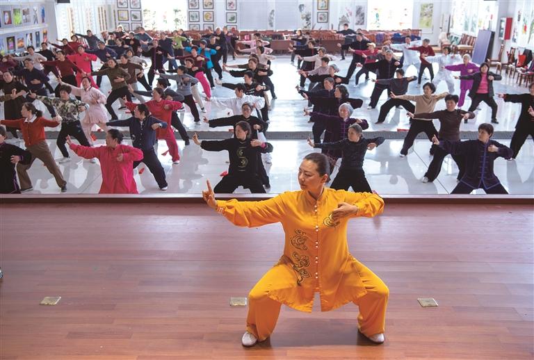 3月24日,海安市老年大学海安高新区分校,学员们在指导老师引领下,习练健身气功八段锦。徐劲柏