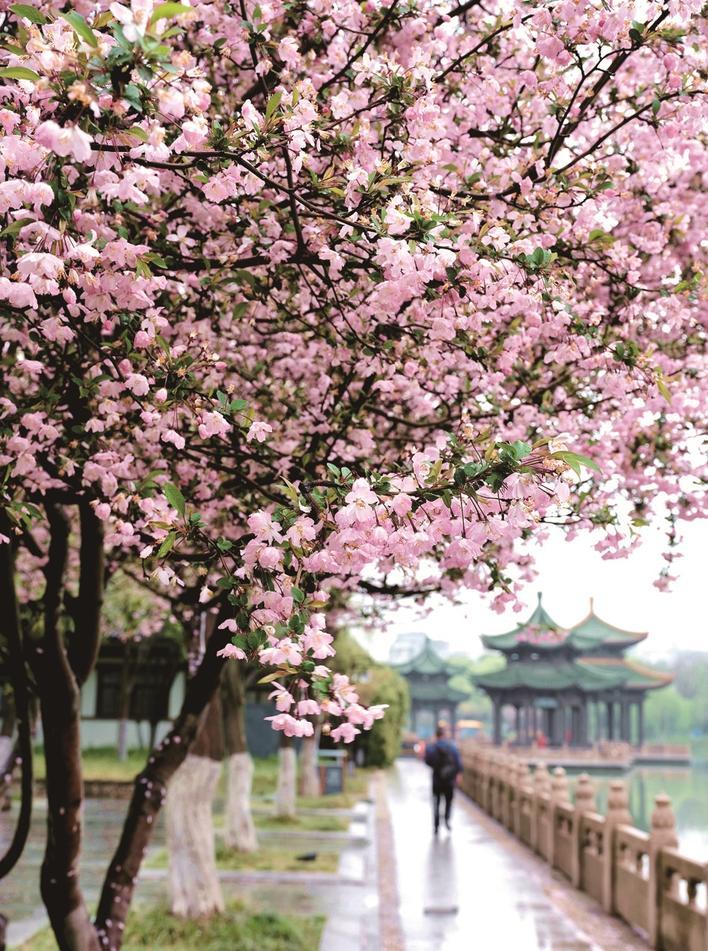 3月27日,市区濠河景区濠西书苑河边步道,微风细雨中一树海棠开得正艳,一名游人从海棠树下走过。宋诚林