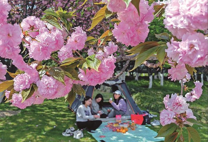 4月7日,市区通吕绿廊五星公园“五花诗廊”旁的大片晚樱竞相开放, 繁花似锦,游客和市民在花树下搭起帐篷,惬意休闲。李斌